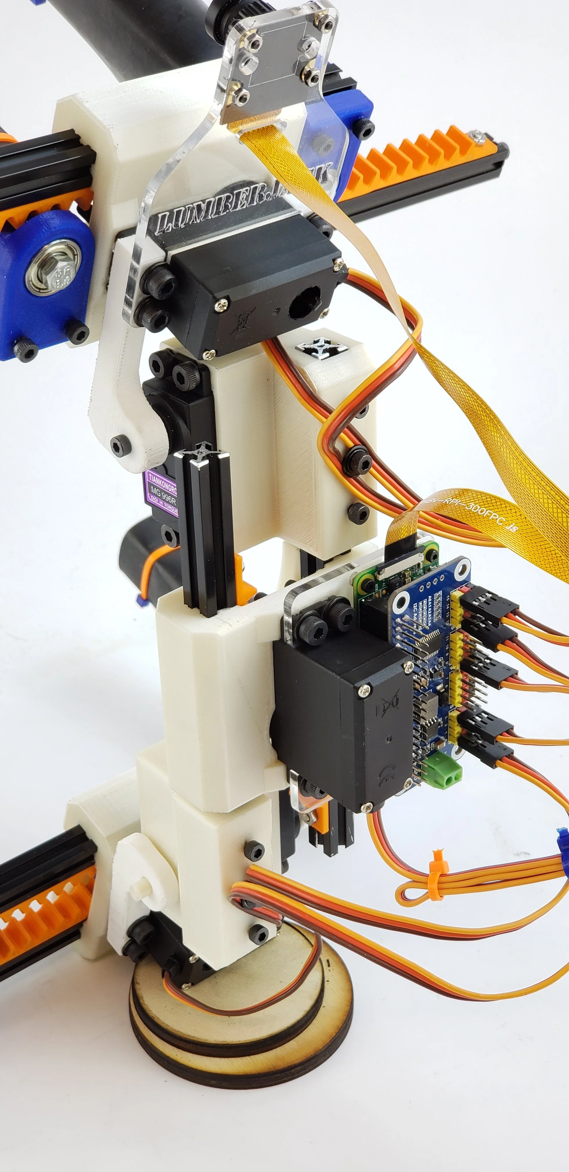 This project was the final assignment for my robotics class. My primary role in my team’s collaboration was to lead the drafting and assembly processes. After creating an initial test bed for optical material sensing and gripper testing, we decided to pursue a modular design, based around three primary dual-rack-and-pinion actuators joined at two pivots. This design allowed for our control board to be mounted centrally, with easy wire management. Additionally, the repeated modular design meant that a few replacement parts could be kept on-hand for maintenance, and gave our robot a clean, uniform look. To gain strength while keeping weight down, we based the robot’s skeletal structure around Makerbeam 10 mm extruded aluminum. The main PLA structures acted as linear bearings, retaining the aluminum extrusions even through extension and contraction.